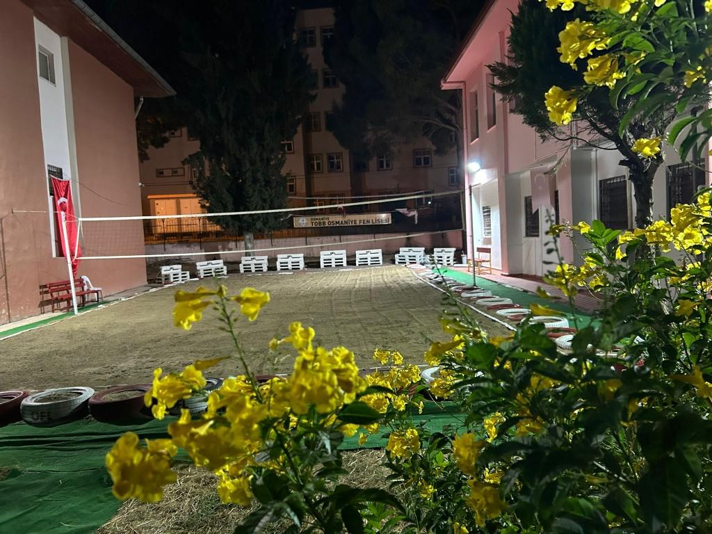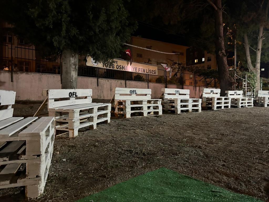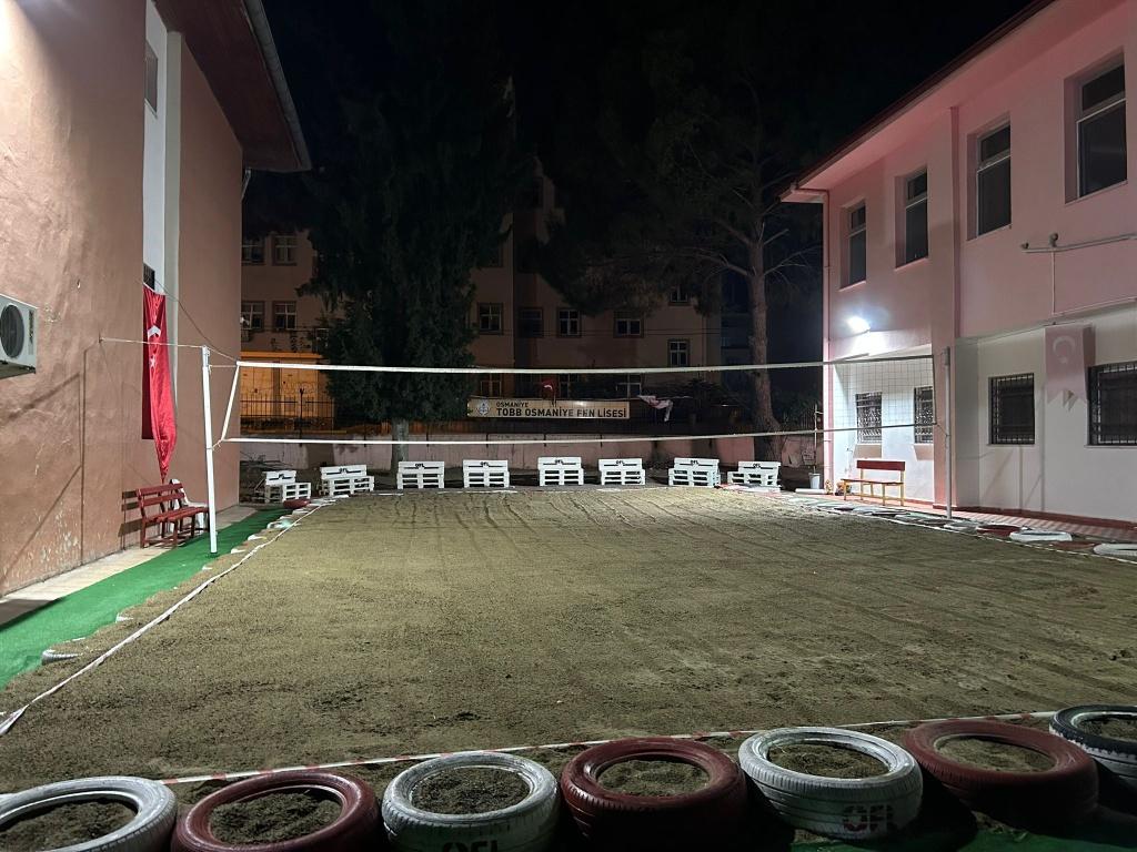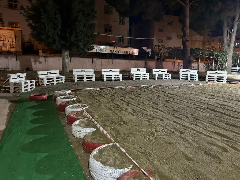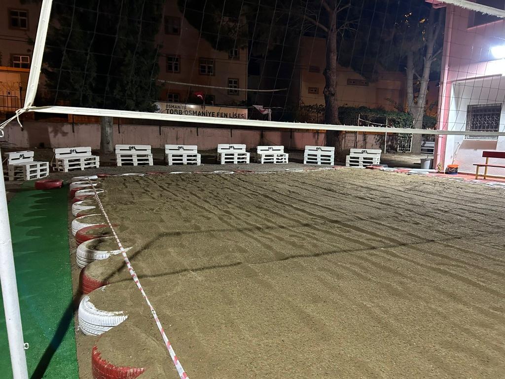 Plaj voleybol sahamız için geri dönüşüm malzemelerini değerlendirerek tribün yaptık. Ahşap paletler kesilip boyandı, rengârenk bir görünüme kavuştu. Hem çevreye duyarlı bir adım atmış olduk hem de maçları izlemek için keyifli bir alan oluşturduk.